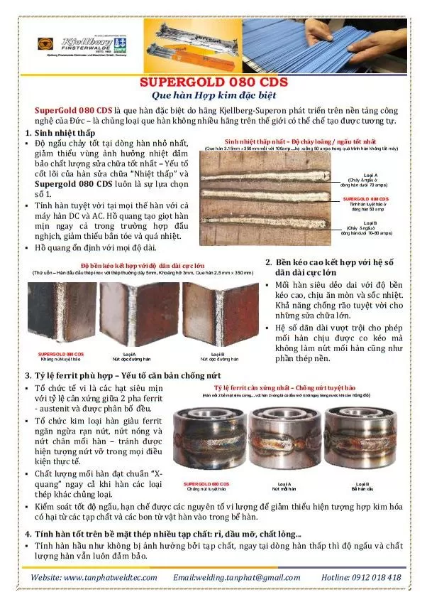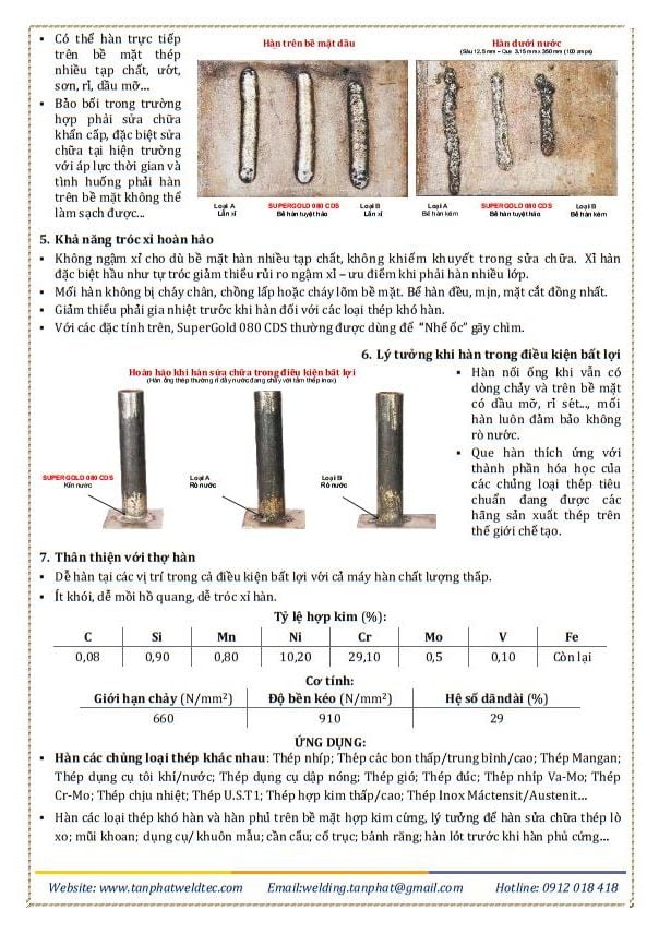 SUPERGOLD 080CDS là que hàn đặc biệt cho hàn sửa chữa do các sở hữu các đặc tính:
